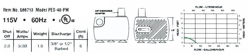 Installation: Operates submersed only Construction: ABS housing, cover, volute and screen, Nylon impeller, Stainless steel motor shaft Maximum discharge head: 2.1' Inlet: Screened Outlet: 3/8" or 1/2" Slip , accepts 3/8" I.D. or 1/2" I.D. tubing. Motor: Wet-rotor (hysteresis) epoxy encapsulated Electrical: 115 volts, 1 phase, 60 Hz, .O3 Amps. 2 5 watts, 6 ft.power cord. Flow Adjustment: Built-in valve adjusts flow from 0 to 45 GPH. Dimensions: 1.2 " high, 1.7" long, 2" wide. Weight: 1 lbs. Listings: cULus