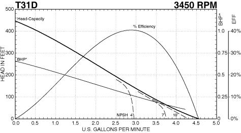 Applications: Flooded Suction, Boiler Feed, Chemical, Coolant and High Pressure. End Suction/Top Discharge: T31 Series pumps are compact to allow installation in small areas. The discharge can be rotated to 90 degrees, 180 degrees and 270 degrees positions to facilitate the most convenient installation. Temperature: 250 degrees F Construction: Buna elastomers, high temperature carbon seals and ceramic seats. Connections: 3/4" FNPT inlet and outlet. Motor: T31 Series pumps utilize custom manufactured D3 motors that incorporate a 304 stainless steel shaft and an upgraded heavy-duty bearing. All D3 motors are 2-pole, 50/60Hz rated and feature UL and CE marks for Worldwide use, totally enclosed fan cooled (TEFC). Electrical: 1/2 HP, 3450 RPM, 208-230/460 Volt, 3 Phase, 60 Hz.