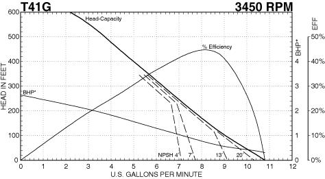 Applications: Flooded Suction, Boiler Feed, Chemical, Condensation, Irrigation, Coolant and High Pressure. Construction: Body: Bronze Fitted, Buna elastomers, high temperature carbon seals and ceramic seats for best hot water service. End Suction/Top Discharge: T41 Series pumps are compact to allow installation in small areas. The discharge can be rotated to 90 degrees, 180 degrees and 270 degrees positions to facilitate the most convenient installation. Temperature: to 300 F Connections: 1" FNPT inlet and outlet. Motor: All D3 motors feature a 304 stainless steel shaft and CE mark approval. T41 pumps can accept most commonly available motors through the use of close or flexible coupling. For wider fluid compatibility, T41 units feature a protective motor shaft sleeve. ODP Motor allows operation at two pole or four pole speeds 3450 RPM. Electrical: 1/2 HP, 3450 RPM, 115/208-230 Volt, 1 Phase, 60 Hz. Weight: 38 lbs.