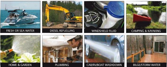 Rule Pumps Charge N' Flow Portable Pump Kit 280 GPH, 12 VDC, RP280KR. It's rechargeable, submersible and used to dewater bilges, as a deck shower, for wash downs, or as a transfer pump. It handles hot or cold water, seawater, antifreeze and diesel. This unit is NOT to be used for potable water. Includes pump, 8' hose, spray nozzle, filter, battery, charger and two types of adapters. The pump handles up to 100 gallons of water per battery charge. Not for use with gasoline, alcohol or any other flammable liquid. Do not use where flammable vapors are present.
